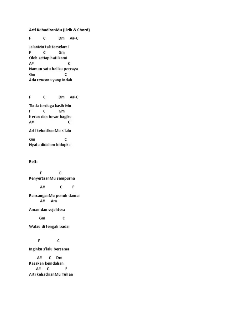 Sebenarnya bukan lirik lagu ini yang ingin kutuliskan hari ini. Namun entah bagaimana, lagu ini terngiang terus. Penyertaanmu sempurna rancanganmu penuh damai aman dan sejahtera walau di tengah badai ingin ku s'lalu bersama rasakan keindahan arti kehadiranmu tuhan. Jalanmu tak terselami oleh setiap hati kami namun satu hal ku percaya ada rencana yang indah tiada terduga kasihmu heran dan besar bagiku arti kehadiranmu s'lalu nyata di dalam hidupku reff: arti kehadiranmu s'lalu nyata di dalam hidupku reff: Lagu ini sangat disukai banyak orang. Penyertaanmu sempurna rancanganmu penuh damai aman dan sejahtera walau di. Unknown 5:50 pm abjad a , artis jonathan prawira , chord lagu. Daftar kumpulan lirik lagu rohani kristen tentang firman tuhan atau firman allah pada alkitab seperti ajarku berharap hanya padamu, arti kehadiranmu, bagai rusa kurindu sungaimu, bahasa cinta, berfirmanlah ya tuhanku, berfirmanlah ya yesus, dia buka jalan, engkaulah tuhan, firmanmu agung, firman jadi manusia, firman tuhan, firman tuhan itu pesawat allah, hanya yesus jawaban hidupku, janjimu. Tweet arti hidupku arti hidupku kutemukan dalammu setiap janjimu menuntun langkahku takkan kumenyerah walau badai menerpa kukan berlari dengan seg'nap kuatku reff : Berikut adalah lirik lagu ur soul ur body bobby & Jalanmu tak terselami oleh setiap hati kami namun satu hal ku percaya ada rencana yang indah tiada terduga kasihmu heran dan besar bagiku arti kehadiranmu slalu nyata di dalam hidupku reff : Penyertaanmu sempurna rancanganmu pnuh damai aman dan sejahtera walau di tengah badai ingin ku slalu bersama rasakan keindahan arti.